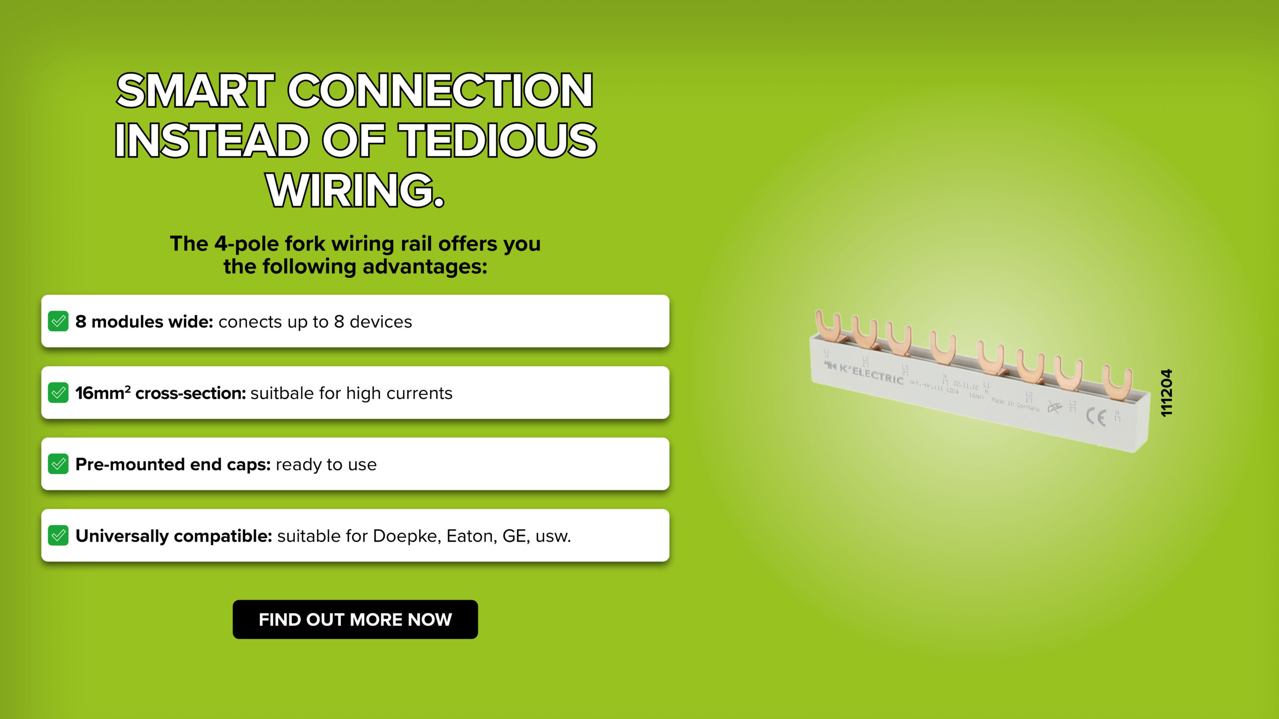 The 4-pole fork wiring rail connects circuit breakers and residual current devices (RCDs) efficiently.