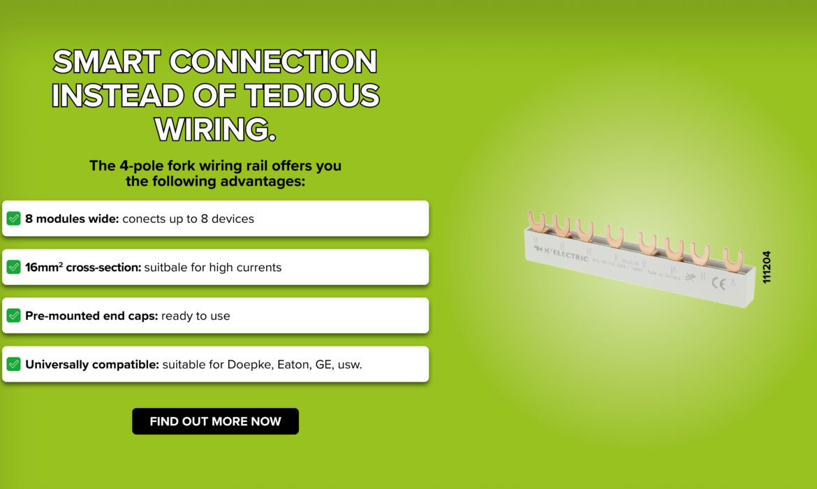 The 4-pole fork wiring rail connects circuit breakers and residual current devices (RCDs) efficiently.