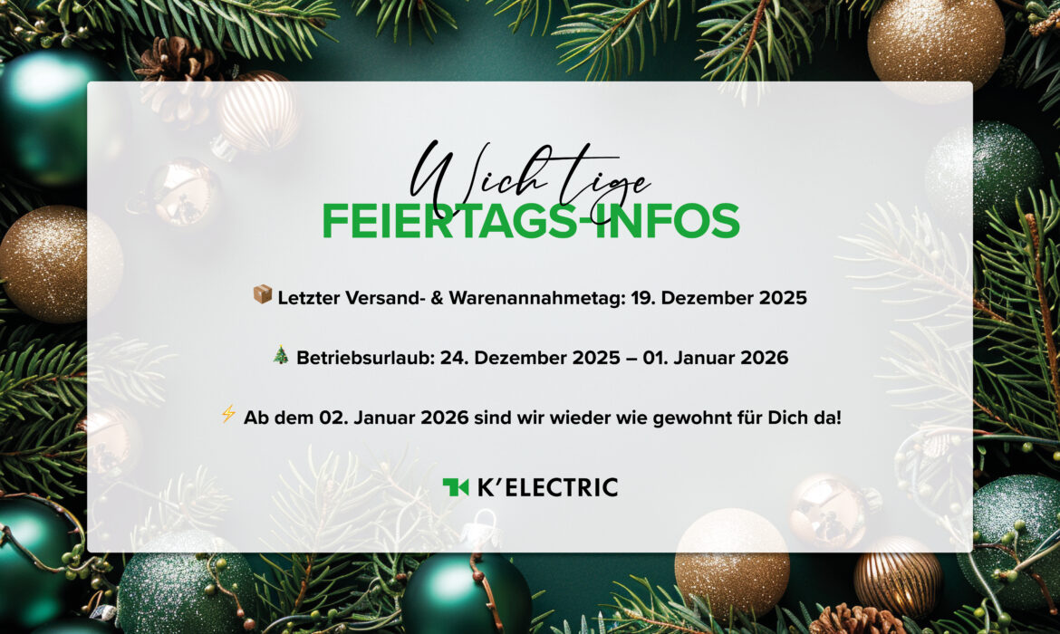 Die Feiertage rücken näher – und wir möchten Dich rechtzeitig über unsere Jahresend-Termine informieren. 🎄 📦 Letzter Versand- & Warenannahmetag: 19.12.2025🎄 Betriebsurlaub: 24.12.2025 – 01.01.2026⚡️ Ab dem 02.01.2026 sind wir wieder für Dich da!Vielen Dank für ein großartiges Jahr voller Projekte, Vertrauen und Zusammenarbeit. Wir freuen uns auf alles, was...